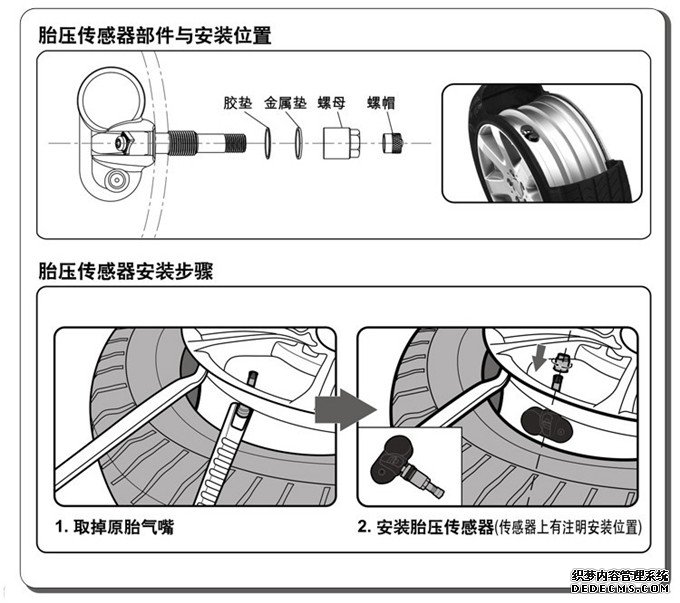 建議在正規(guī)的輪胎店或者4S店進(jìn)行安裝,具體安裝方法可以參照?qǐng)D示或致電400服務(wù)熱線進(jìn)行指導(dǎo)。安裝時(shí)請(qǐng)將顯示器打開(kāi),以便在安裝的過(guò)程中顯示器及時(shí)對(duì)碼顯示。傳感器安裝完畢需給輪胎做動(dòng)平衡;